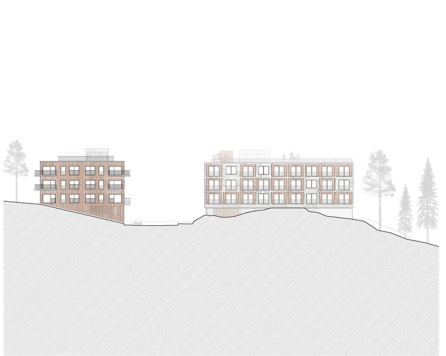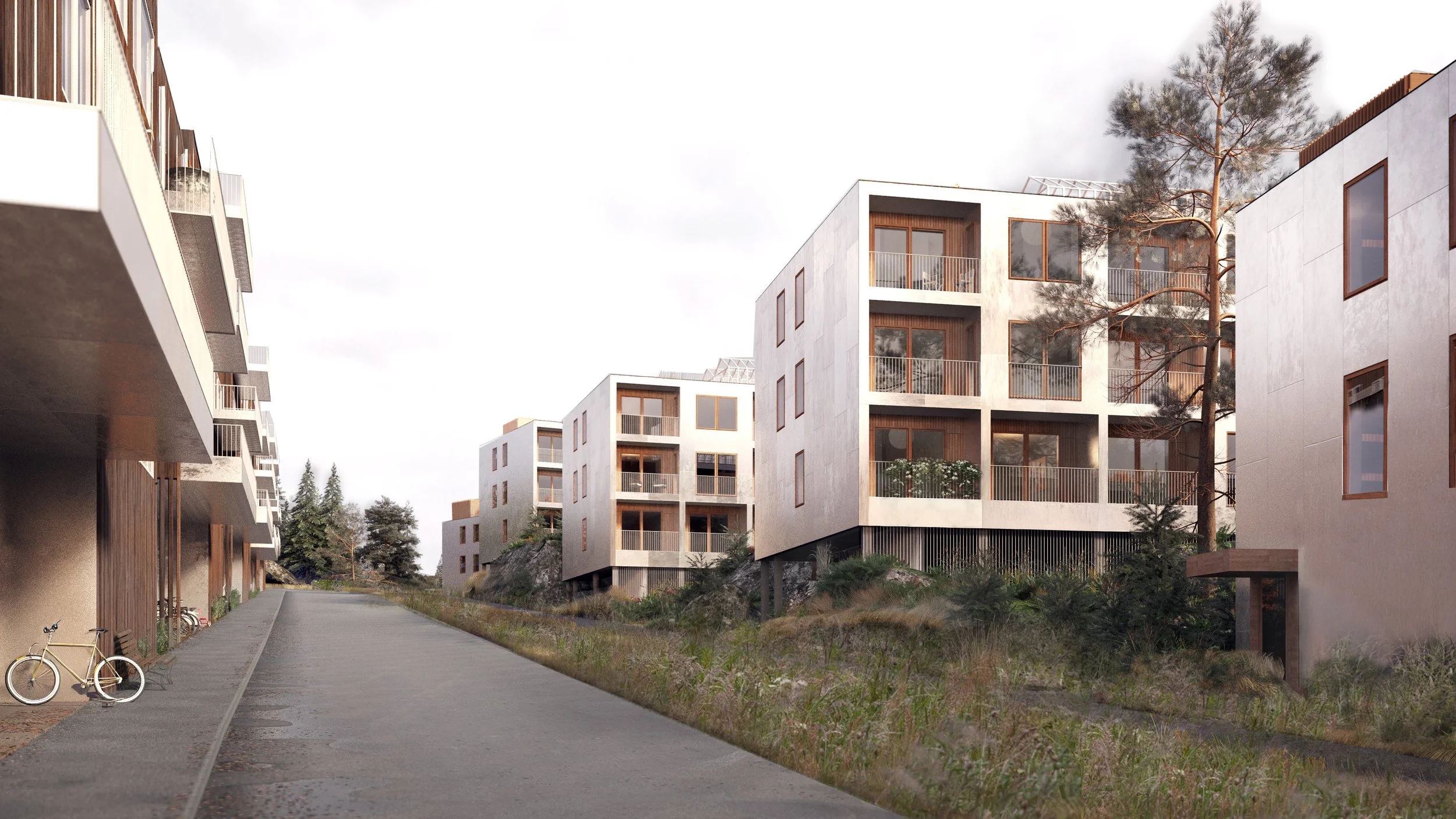 Idén är att behålla befintlig topografi och natur mellan byggnaderna och därmed få en naturlig koppling till det omgivande skogsområdet. Detta möjliggörs genom att placera bilarna under husen i underjordiska våningar. Gröna hustak med gemensamt växthus och odlingslådor ger utrymme för samling, lek och trädgårdsarbete. Husen är konstruerade i prefabricerade moduler. Fasaden är klädd i trä och varmförzinkad plåt med balkonger till alla lägenheter. Handskisser på för takträdgårdar och entrérum av landskapsarkitekt Johan Paju.