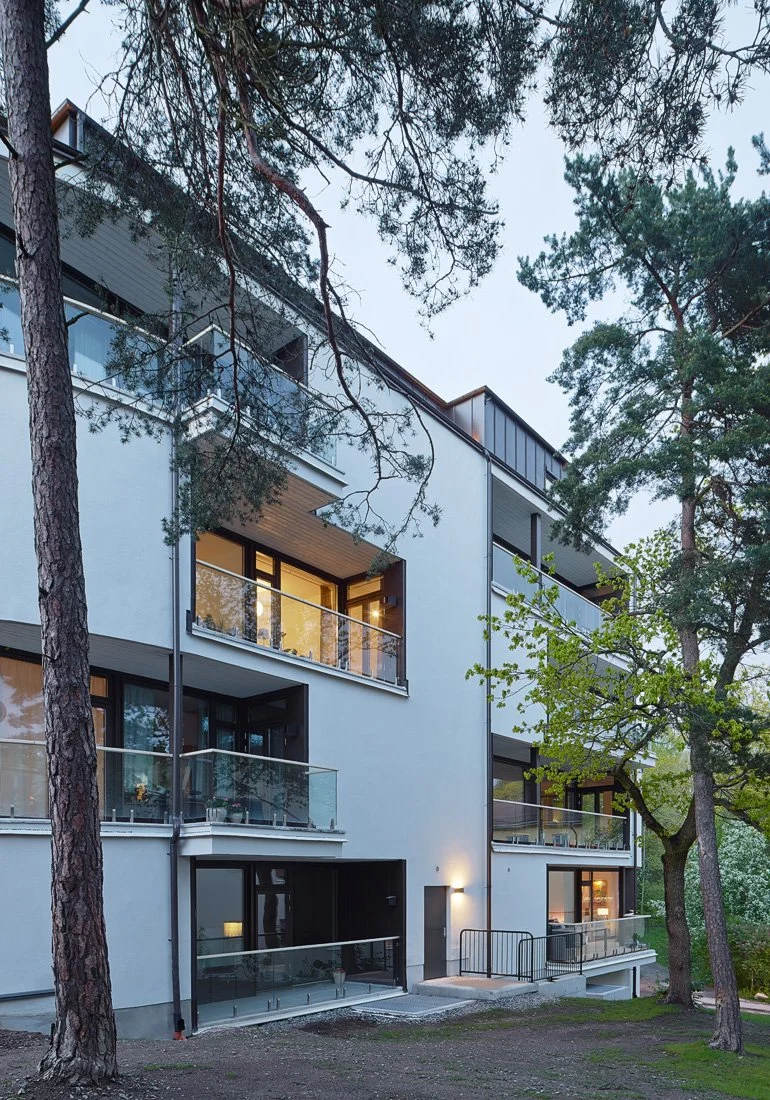 Flerbostadshus som ligger på gränsen mellan Smedslättens villakvarter och naturen. Husets avrundade hörn återspeglar formen på det garage som tidigare stod här och som delvis finns kvar i bottenplan. Fyra våningar samt en takvåning har byggts på det befintliga garaget. Andra våningen på garaget har bara delvis rivits, vilket skapar en öppning mellan grönområdena runt huset. Här ryms totalt 18 lägenheter. Putsade väggytor står i konstrast till de indragna och uppglasade fasaderna. Varje lägenheter har två balkonger med utsikt åt olika väderstreck. Takvåningens två lägenheter, båda på 5 rum och kök, har två terrasser och en storlek på 130 m2.