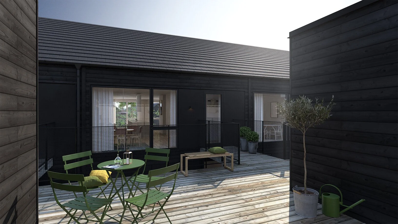 På uppdrag av Panghus ritade vi 30 bostäder bestående av 20 radhus och 10 kedjehus. Husen smälter fint in i sin omgivning med svartmålad träpanel, stora fönsterpartier och solceller på taket. Kedjehusen med sadeltak har en bostadsarea på 144 kvm och radhusen120 kvm. Husen har skogen och naturen som granne och ligger precis intill sjön Runn.