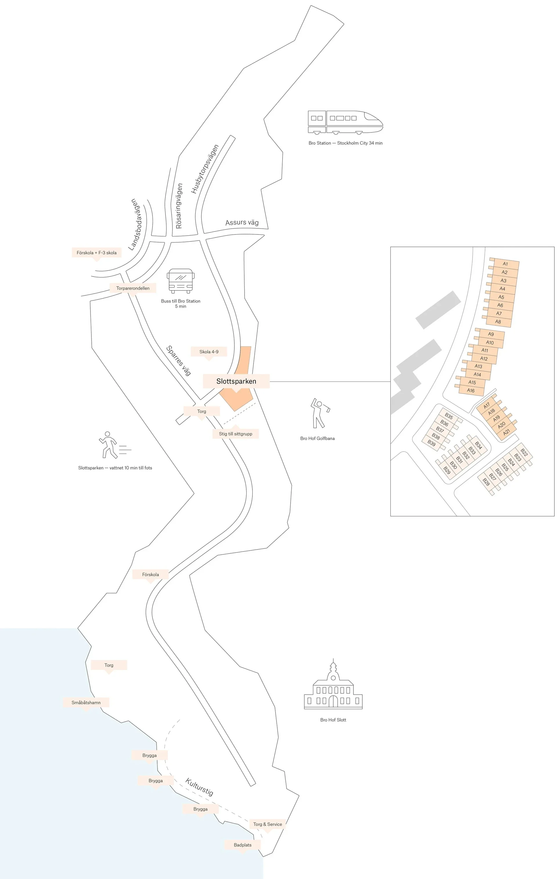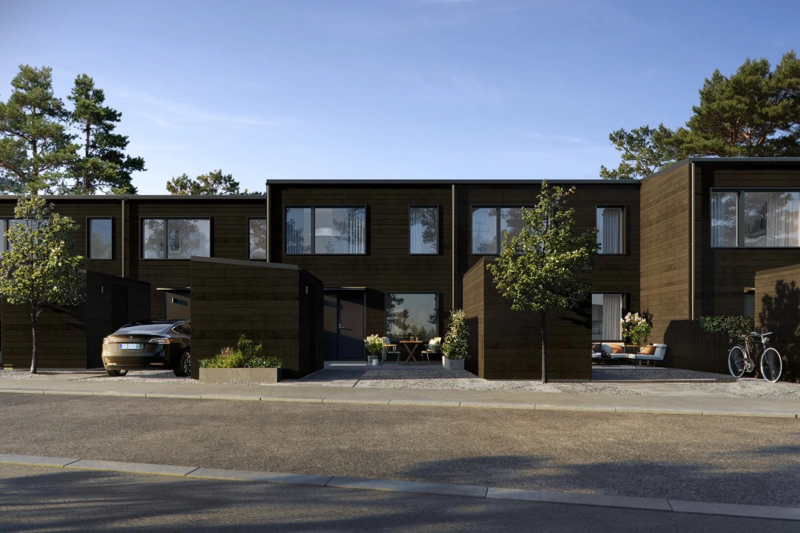 För Aros bostad (Besqab) ritade vi det här området i Bro med 39 radhus. Området kallas Slottsparken och är en del av Bro Mälarstad som har ett vackert och naturnära läge. Varje hus är placerat med anpassning efter berget och naturen och de svarta träfasaderna smälter fint in i tallskogen. Bostäderna är omsorgsfullt planerade för att rymma så många funktioner som möjligt och ändå kännas öppna och ljusa. Husen byggs för att Svanenmärkas.