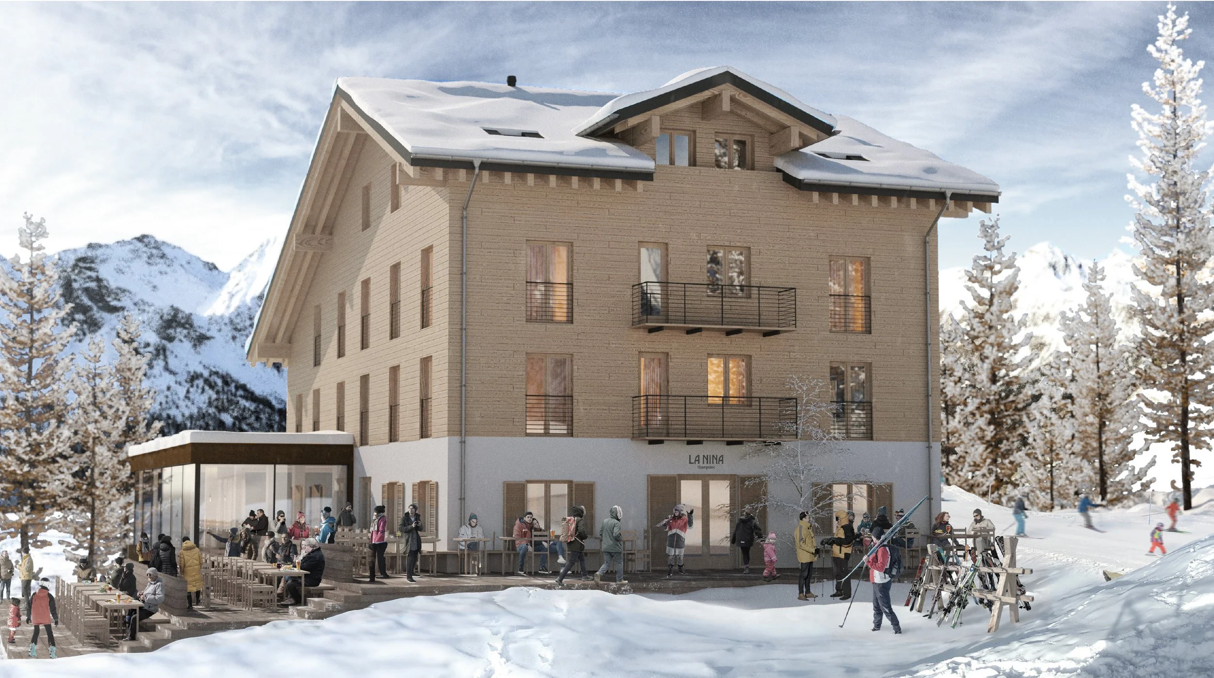 Det befintliga timmerhuset återuppbyggs i traditionell form och material men med ny fönstersättning. Programmet består i en lounge, bar, restaurang, reception, spa och 19 hotellrum. I det här projektet har vi samarbetat med Wingårdhs Arkitekter som ansvar för inredningen.