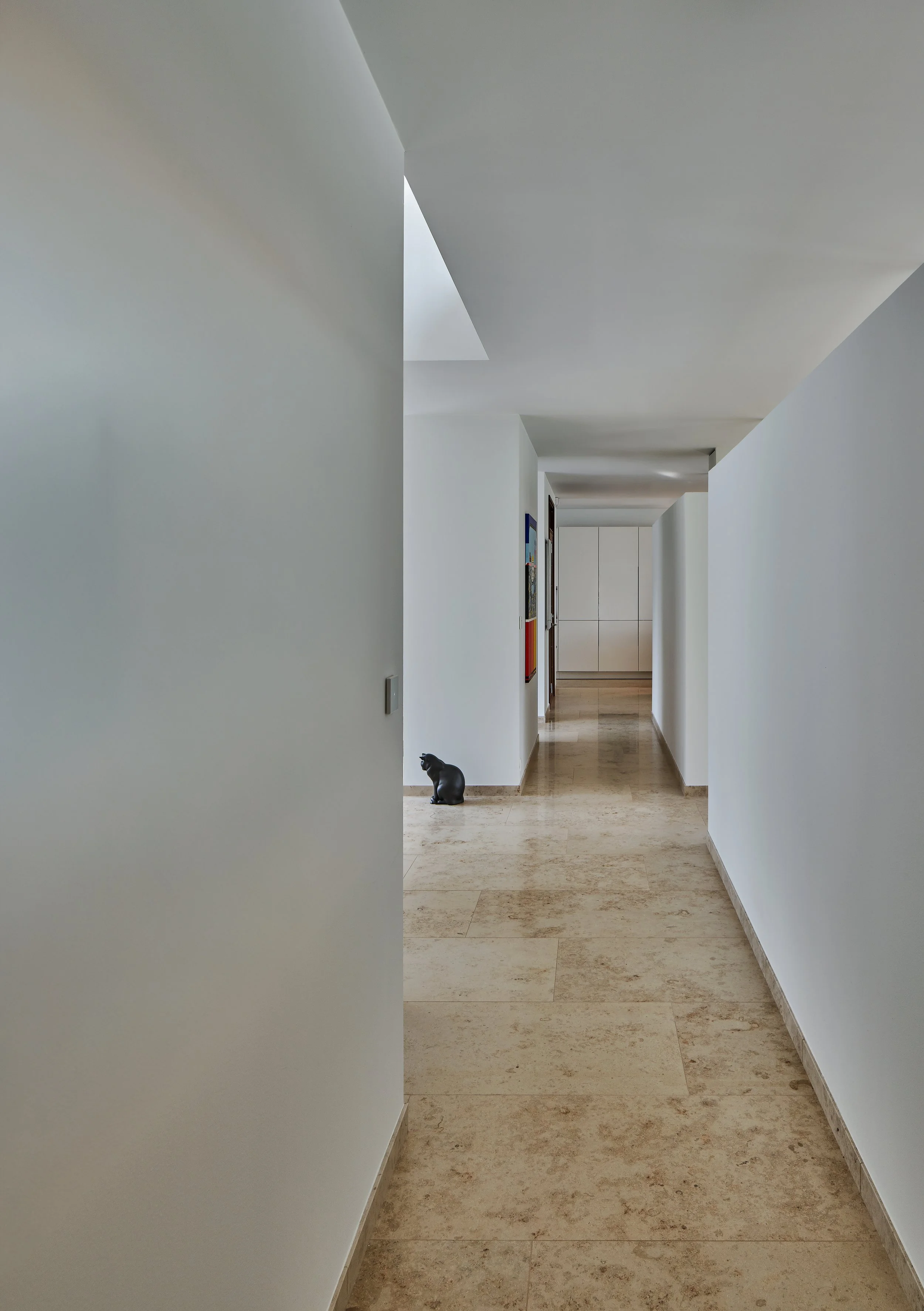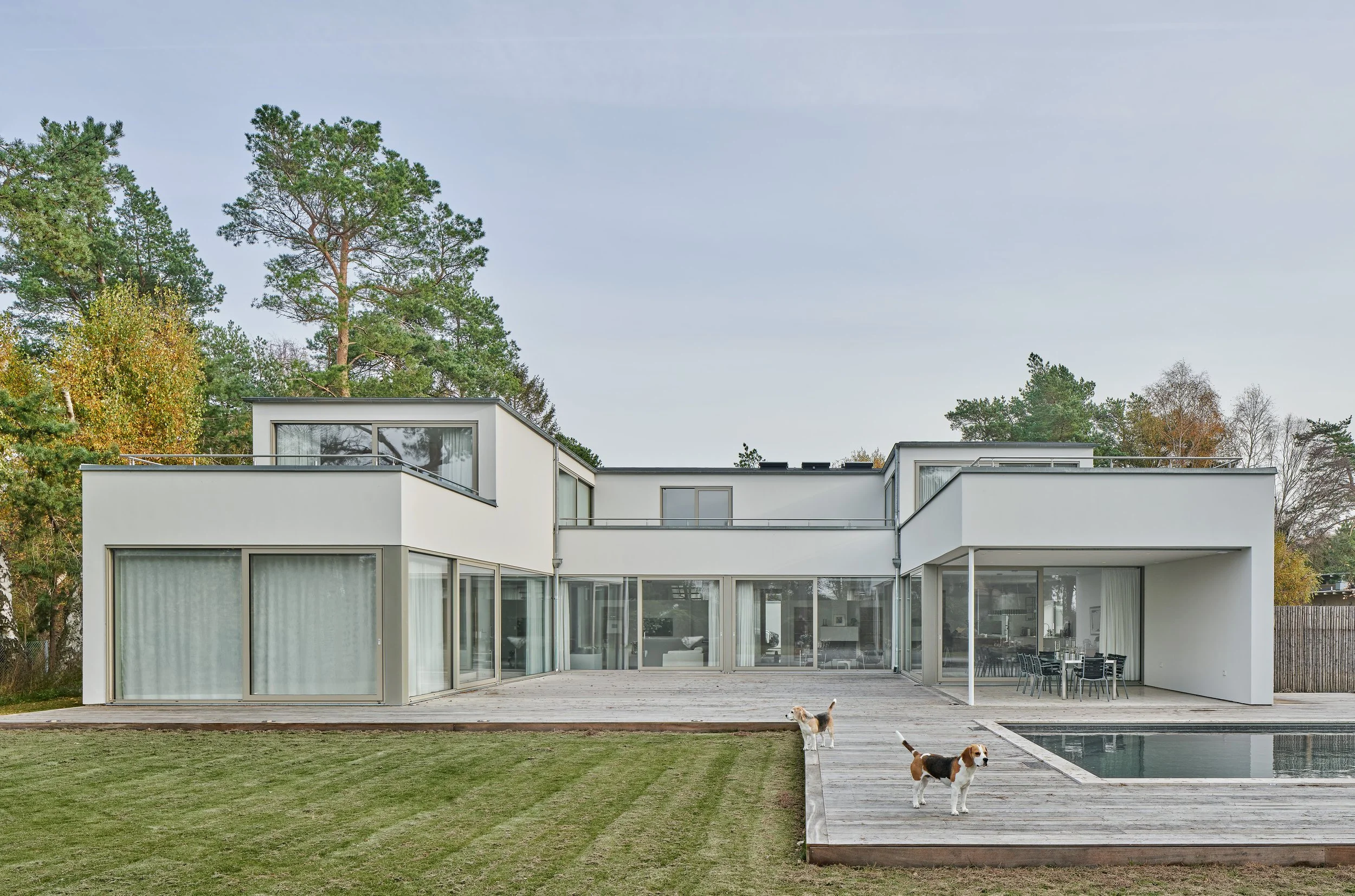 I Ljunghusen, i Skåne ligger denna vitputsade villa, med sluten fasad utåt och stora glaspartier in mot en privat gård. Med sina enkla och rena linjer underordnar sig byggnaden tallskogens siluetter. Genom ett släpp i byggnadsvolymerna kommer man in på en kringbyggd stenlagd entrégård. Hallen och vardagsrummet avdelas med väggar som släpper mot tak och ett trappsteg ner vilket skapar fina, intrikata rumssamband och släpper igenom ljus. Golven i hallen är klädda i kalksten och vardagsrummet ekparkett. Väl inne i vardagsrummet öppnar huset upp sig mot trädgården, med stora skjutglaspartier, som är möjliga att öppna upp, och på så vis expandera de sociala ytorna. Husets form, skapar här en vindskyddad plats för umgänge på soldäcket och vid poolen.