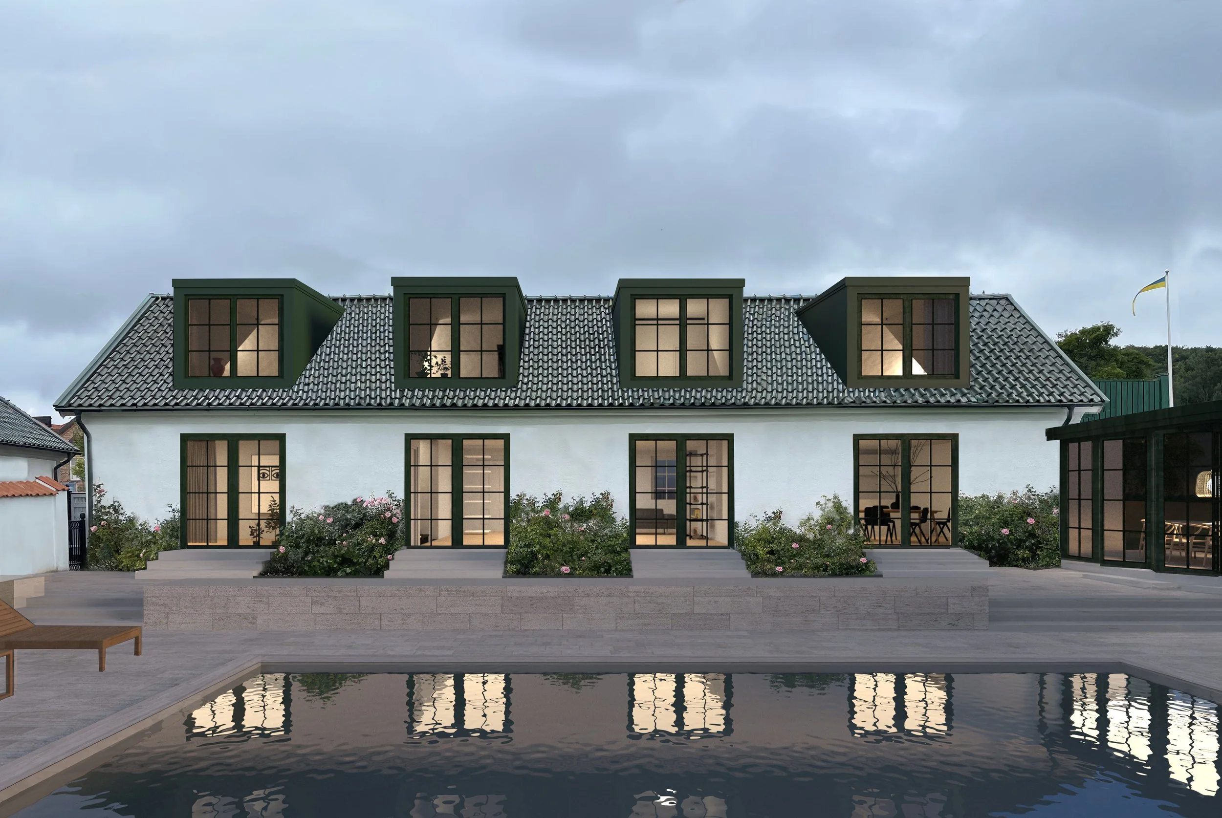 Längs med Båstads slingrande kullerstensgator ligger detta hus från 1800-talet. Vårt uppdrag var att med stor hänsyn till befintligt hus anpassa byggnaden till modern bostad för en familj. Byggnaden karaktäriseras av den vitputsade fasaden, spröjsade fönster, glaserat taktegel och vackra invändiga snickerier. I ombyggnaden görs första våningen om till en social del med entré, vardagsrum och kök i fil. Nya takkupor på ovanvåning skapar rymliga och ljusa sovrum. Rummen på entréplan får nya förstorade öppningar mot inramad gård med pool, stenlagda sociala ytor och trädgård. Ett nytt orangeri och spaljé med klättrande rosor tillkommer också.