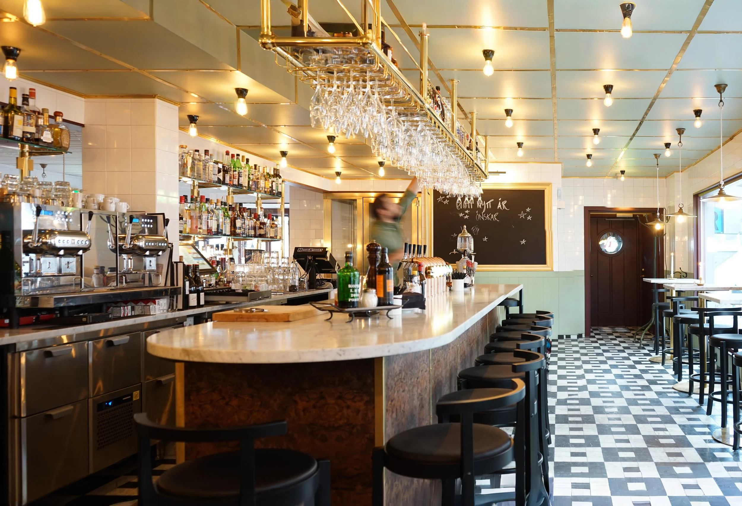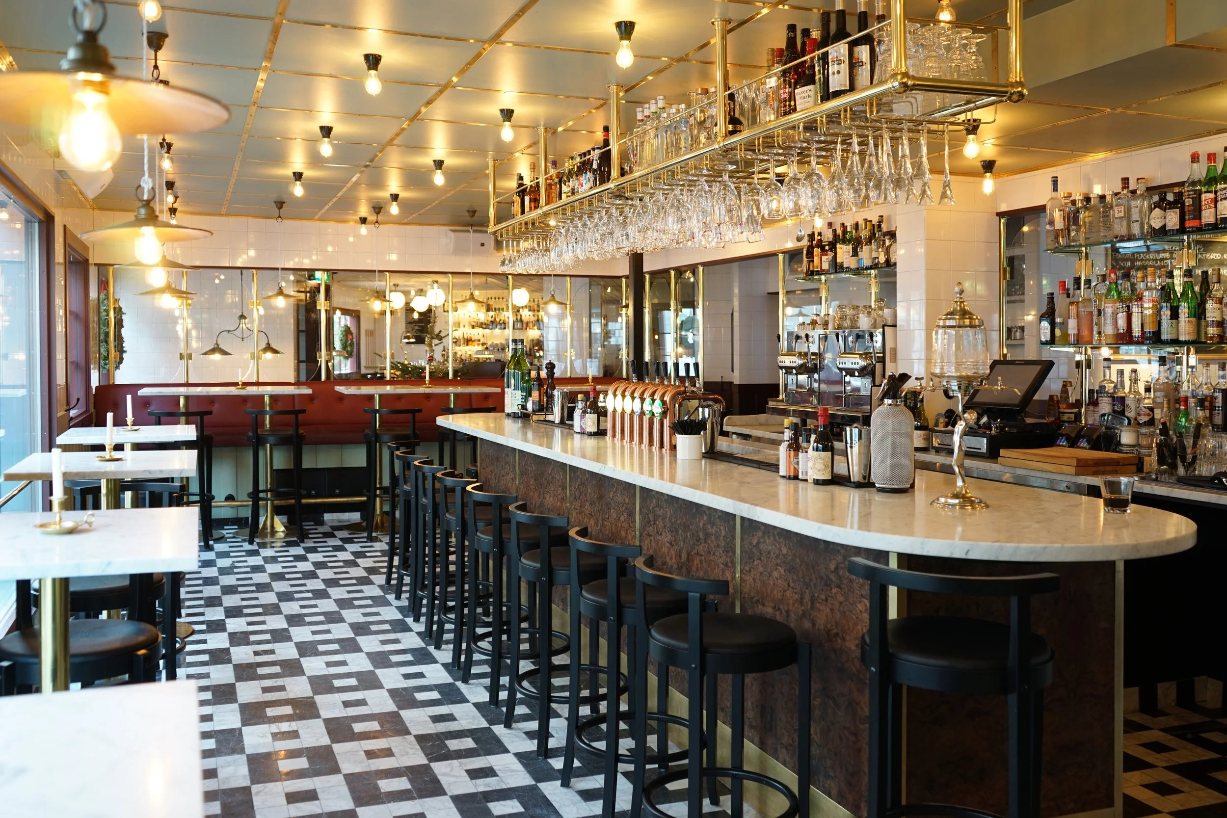 Brasseriet ligger på torget i hjärtat av Åre. Här finns plats för både after ski, middag och umgänge kring baren. Fönstren vetter ut mot torget medan andra sidan ansluter till den större restaurangdelen. materialen och kulörerna är genomgående klassiska med skinn, marmor, mässing och mörkt trä. Golvet är klätt i natursten i en variant av klassiskt schackrutigt mönster. För tankarna till en fransk bistro.