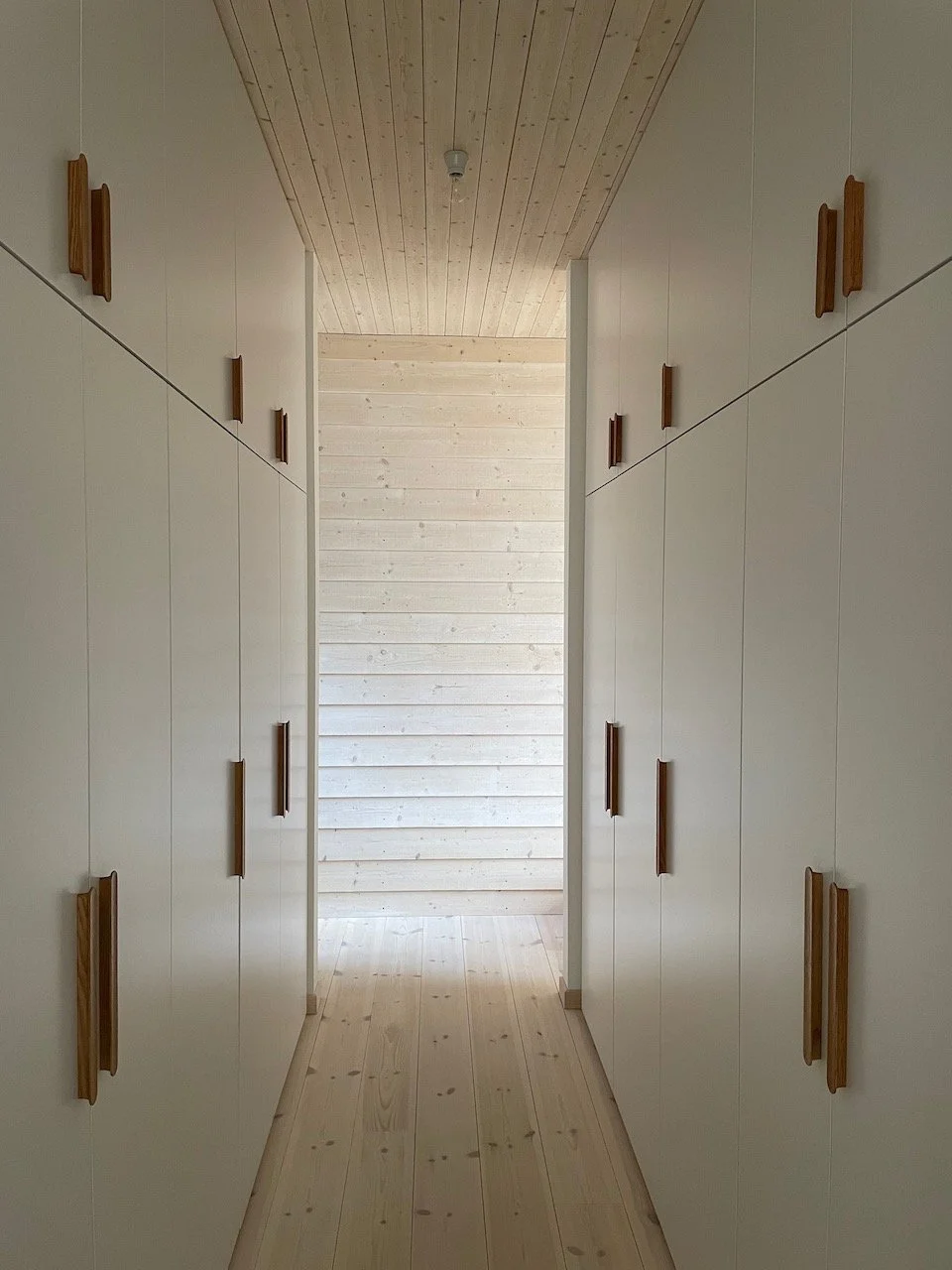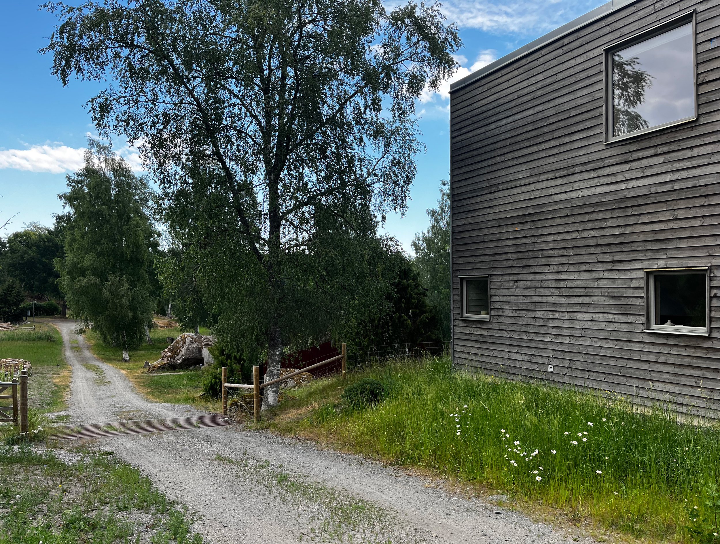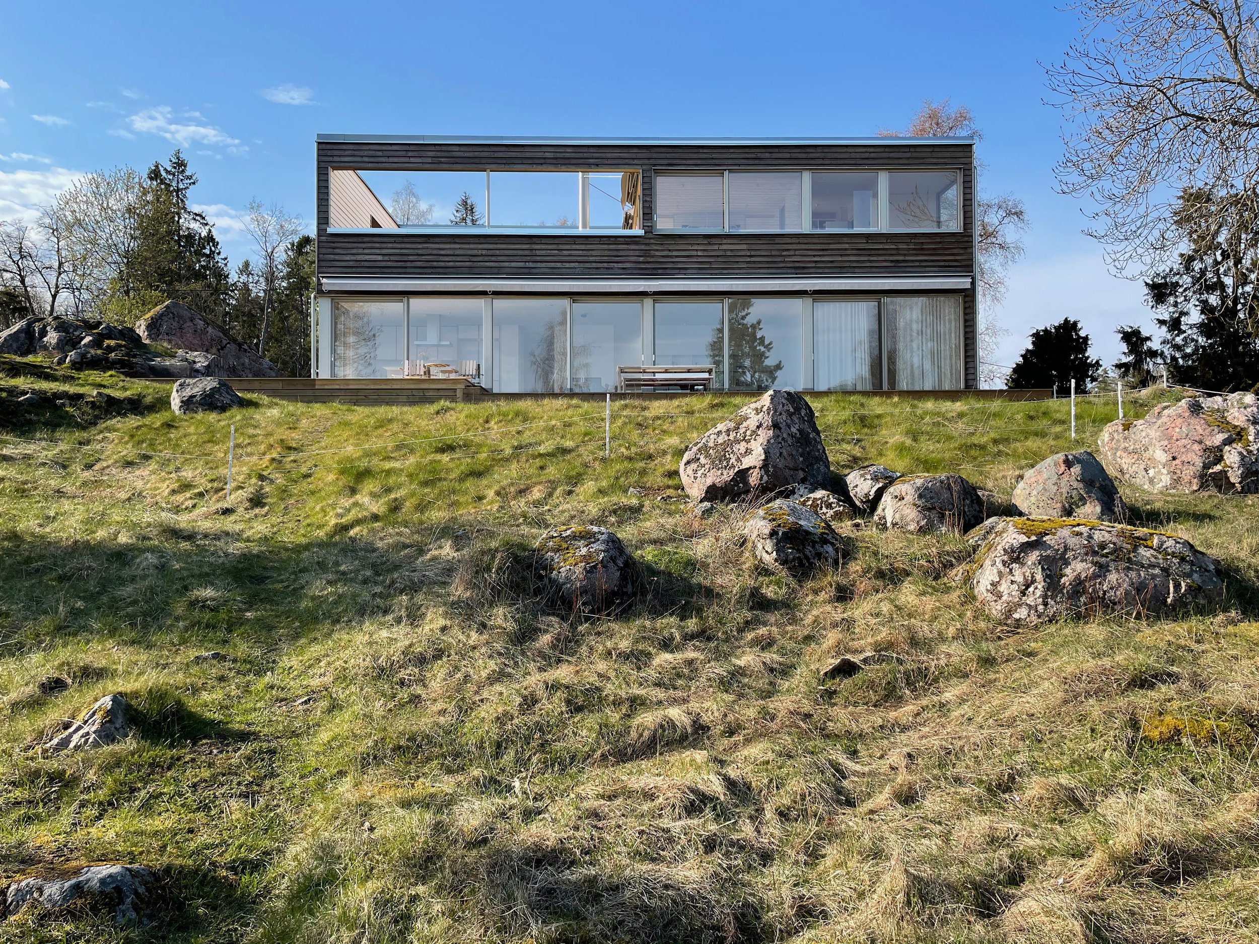 I ett område bestående av ängsmark och fårhagar invid en liten sjö ersatte det här huset ett uttjänt fritidshus från 40- talet. Huset är uppbyggt i två våningar kring kvadratens geometri. De sociala delarna, vardagsrum och kök är placerade i husets framkant och öppnar upp sig med stora glaspartier ner mot sjön. Stommen är av trä där limträbalkar i bjälklagen möjliggör stora spännvidder. Ytterväggarna är in- och utvändigt klädda med sågad fjällpanel. Allt trä invändigt är behandlat med vitpigmenterad lut och olja, utvändigt järnvitriol. En generös altan omger huset och formar sig efter landskapet. I uppdraget ingick även att rita en komplementbyggnad för traktor och redskap som gavs stora skjutpartier i faluröd panel.