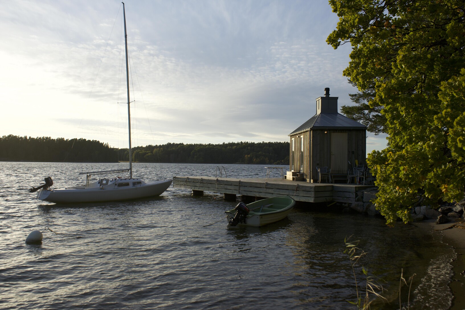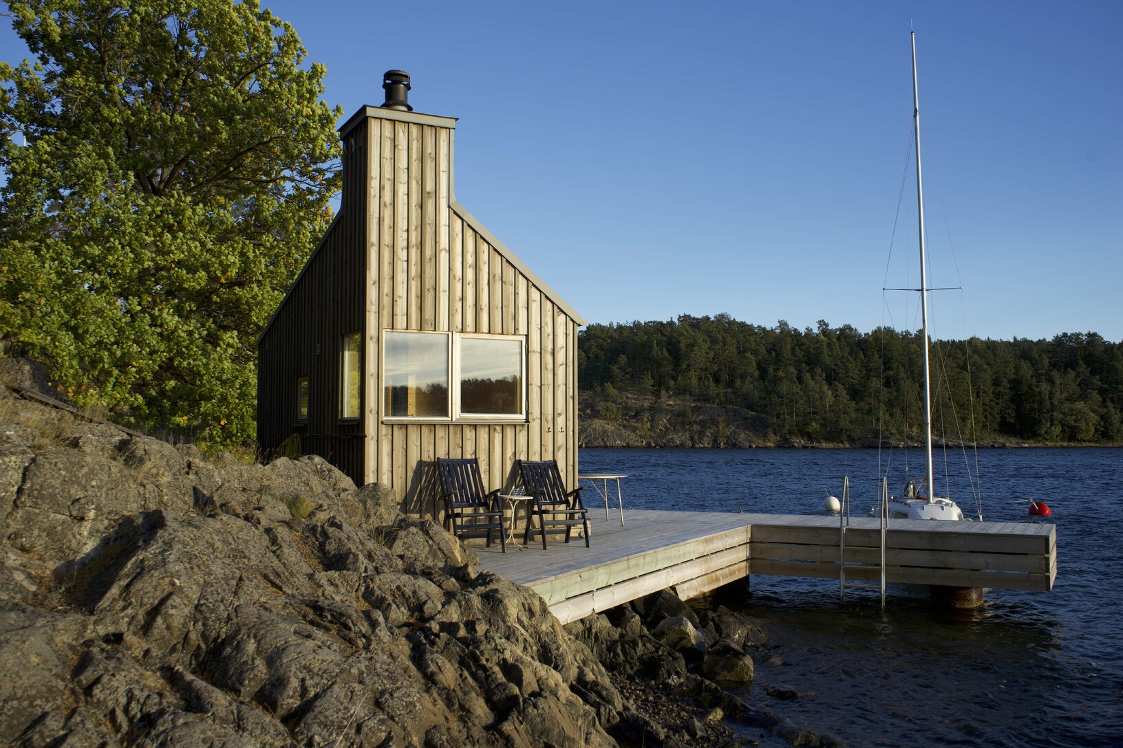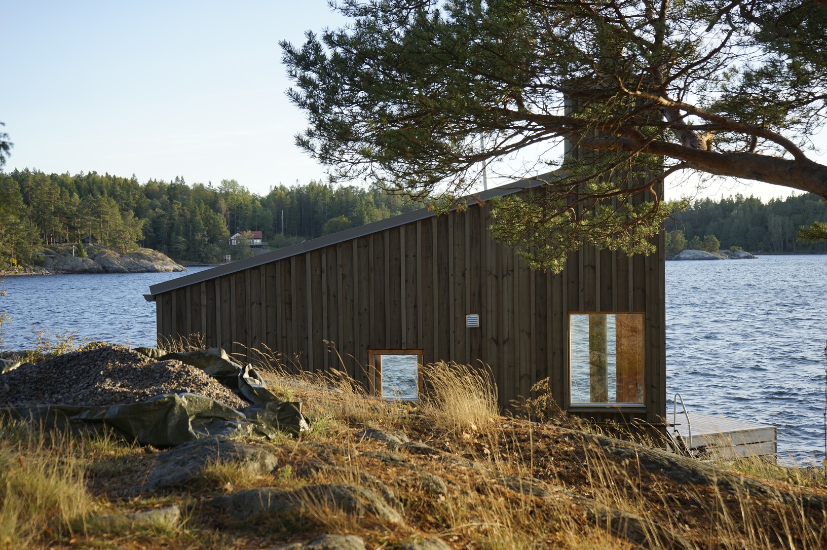 En liten bastubyggnad på en udde i Stockholms skärgård. Det asymmetriska takets sammanbyggnad med skorstenen gör att huset upplevs helt olika beroende av från vilket håll man ser det. Inifrån bastun är fönstren placerade så att man ser rakt ut över fjärden.